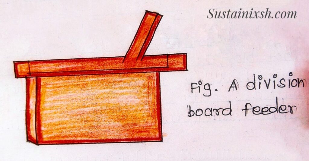 6. Division Board (D.B) Feeder – Beekeepers use this frame-like wooden trough to feed sugar syrup during heat, dearth periods, or water shortage. During times of food shortage, such as extreme heat or dry seasons, beekeepers help their colonies by providing artificial feeding. The Division Board Feeder (or D.B. Feeder) is a wooden trough-like frame placed inside the hive to hold sugar syrup or honey solution.