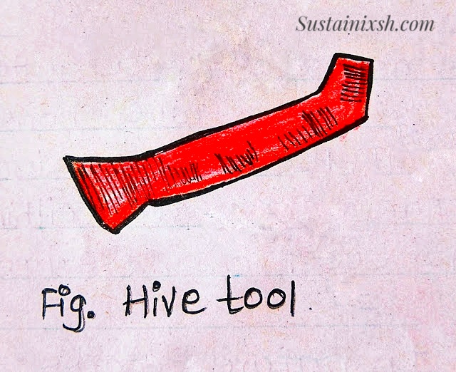 2. Hive Tool – They use a flat steel tool to separate hive boxes, remove frames, and scrape off glue or comb pieces. The hive tool is like a beekeeper’s mini crowbar. It’s a small, flat, steel instrument used for several purposes during hive inspection. Beekeepers use it to separate hive boxes, lift frames, and scrape off excess wax or propolis (bee glue) that builds up inside the hive.